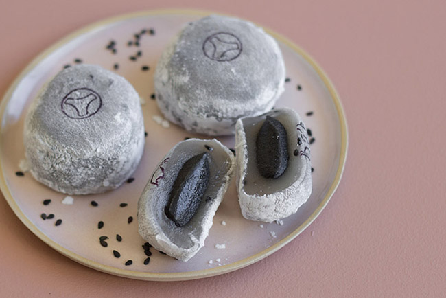 Ce mochi très zen possède sous son enveloppe blanche poudrée un coeur noir de sésame à la saveur à la fois douce & amère. Le sésame est une des toutes premières plantes oléagineuses que l’homme a mis en culture. Symbole d’immortalité, il stimule le cerveau, grâce à sa teneur élevée en phosphore et en magnésium.
