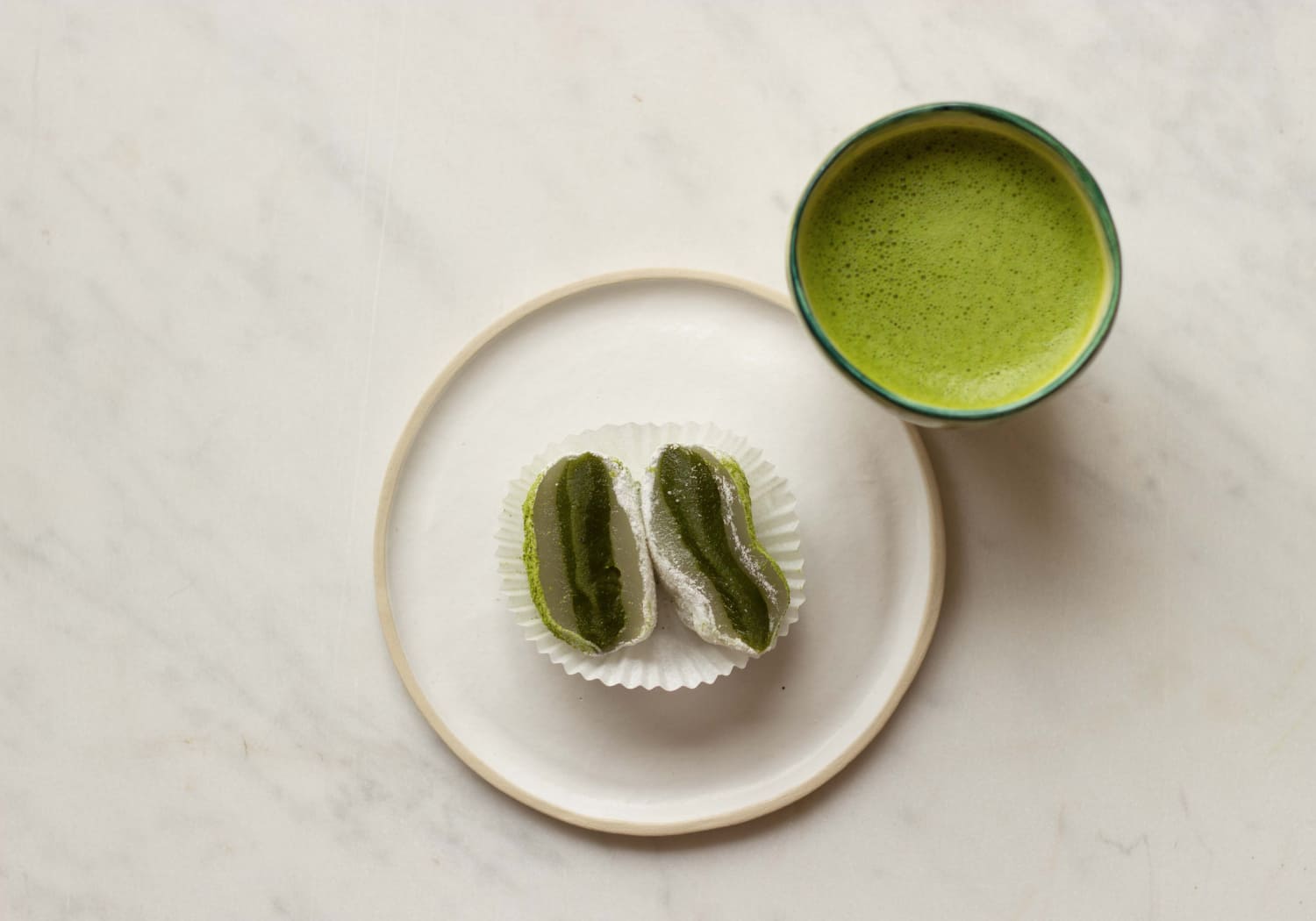 Fouettez l’équivalent d’une cuillère à café rase de matcha avec 90ml d’eau à 70°C, à l’aide d’un chasen (fouet en bambou). Dégustez sans attendre, accompagné du mochi de votre choix.