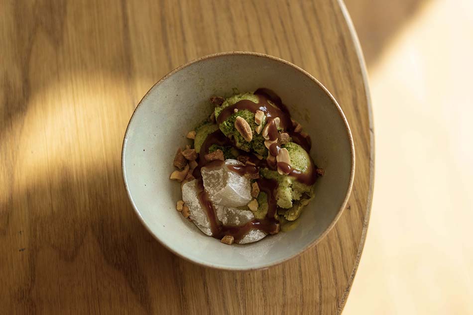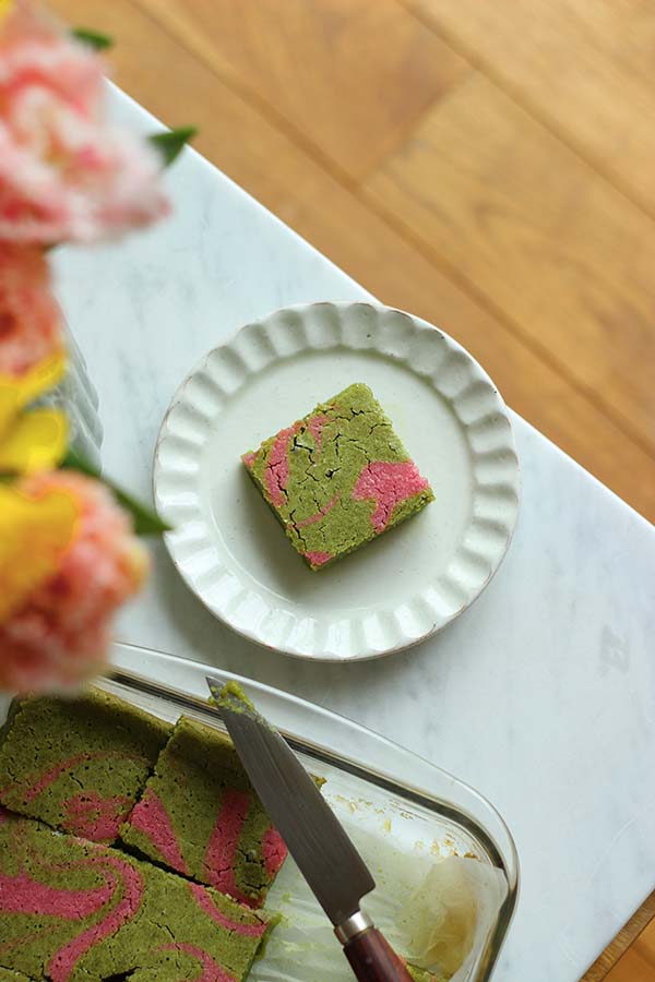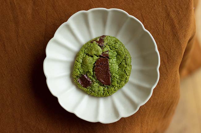L’association matcha et épices est aussi inattendue que délicieuse. Mais il y a une chose essentielle à savoir avec le matcha en cuisine : il ne faut jamais le cuire, car alors il s’affadit et perd de sa brillance, en couleur comme en saveur. Le mieux est donc de l’ajouter après cuisson, comme ici en nappage mélangé à du chocolat blanc...