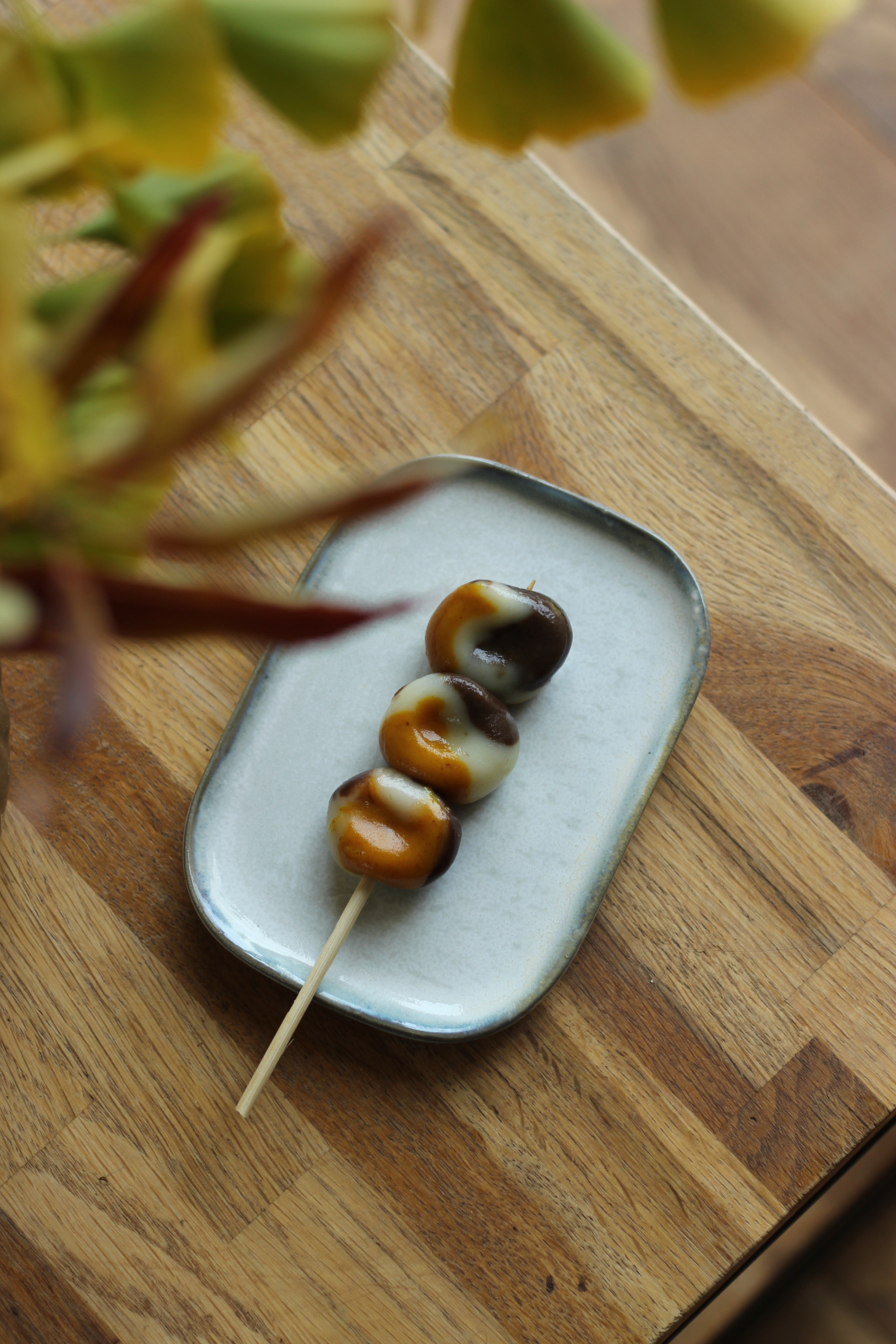 Pour marquer ce moment spectaculairement beau de l’année, je vous propose de préparer des kôyô dango à la manière de leurs cousines printanières, les hanami dango. Pour rappel, les dango sont des types de mochi, que l’on cuit à la manière des gnocchis et que monte en brochettes. Les plus courantes sont les mitarashi dango, qui sont nappées d’une sauce sucrée salée à la sauce soja. Mais pour ces dango-ci, je vous propose de les parfumer avec les saveurs reines de saison : les épices chaudes et le chocolat.