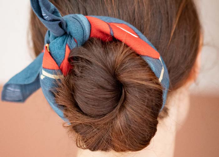 Originalité et poésie dans les cheveux avec ce furoshiki simplement noué | Crédit photo : Agence Lucky