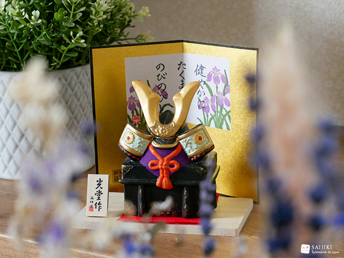 A l’intérieur des maisons, on installe des go gatsu ningyô, des “poupées de mai”. C’est un présentoir à plusieurs étages sur lequel on place une armure et d’autres objets ayant rapport avec des samouraïs : katana, éventail, etc. Faute de place, on voit de plus en plus de familles acheter et installer uniquement le casque appelé kabuto.